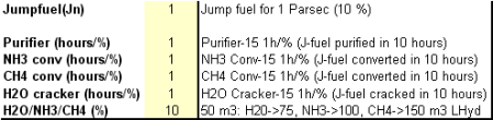 Water crackers ammonia converter and methane converters are rated in hours per hull percentage converted, this is the output percentage and not the input. A 1 hour per % water cracker would convert 0.67% of water into 1% of LHyd per hour, an equally rated ammonia converter would convert 0.5% ammonia into 1% LHyd per hour and the methane converter would convert 0.33% of methane into 1% LHyd. The fuel purifier mentioned above, is also rated in hours per fuel percent purified.